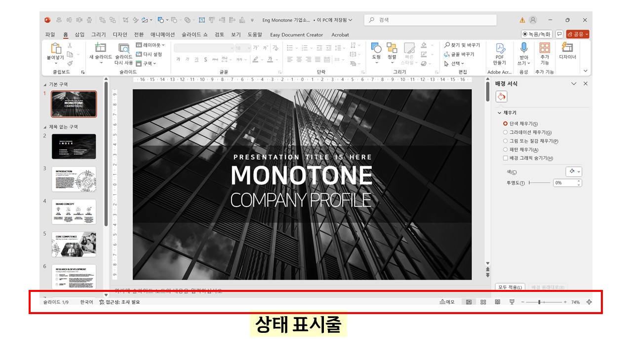 화면 하단에는 상태 표시줄이 있습니다. 현재 슬라이드 번호, 언어, 확대/축소 비율, 보기 모드(기본 보기/슬라이드 쇼/슬라이드 정렬 등) 전환 버튼이 위치해 있습니다.