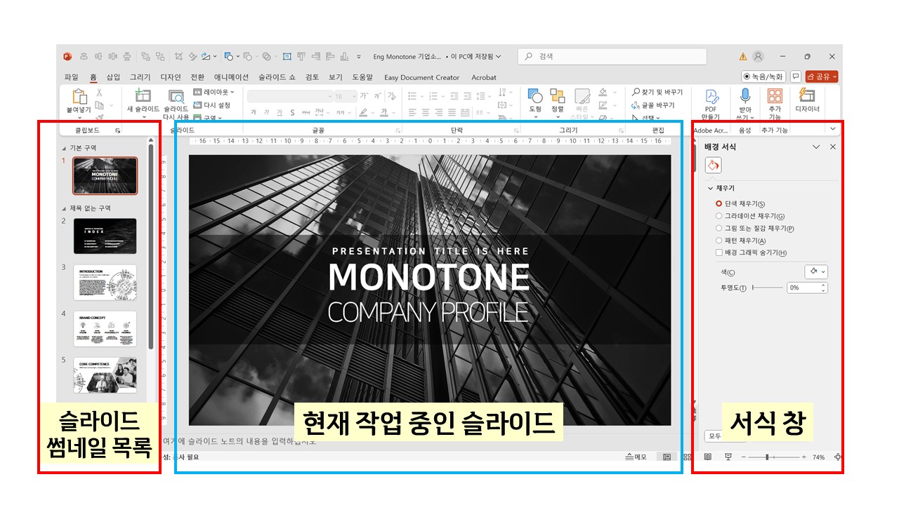 슬라이드 작업을 시작하면, 왼쪽에는 슬라이드 썸네일 목록, 가운데는 현재 작업 중인 슬라이드, 오른쪽에는 상황에 따라 등장하는 서식 창이 구성됩니다.